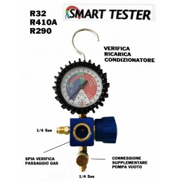 - SMART TESTER PER GAS R410A - R32 - R290 - MANOMETRO A SETTORI COLORATE DI FACILE COMPRENSIONE DELLO STATO IMPIANTO - CONNESSIONE IMPIANTO 5/16 Sae F CON PREMISPILLO - MANUALE D'ISTRUZIONE USO A CORREDO - CONNESSIONE INGRESSO 1/4 Sae M